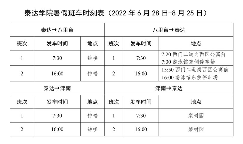 1.泰达与八里台、津南校区通勤班车自2022年6月28日(周二)至8月25日(周四)按照假期班车方案运行,具体班次为: